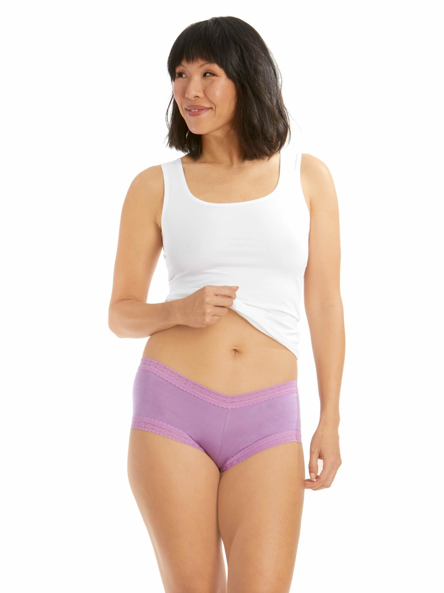 The Boyshort is trimmed with soft lace and has a medium rise, low leg, and cheeky back coverage.